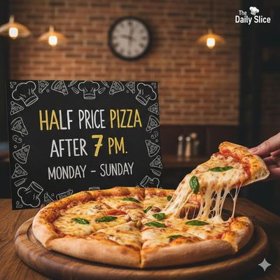Purchase any 2 pizza after 7pm and pay half price for the second pizza (whichever is lower priced). Monday - Sunday